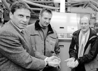 Im Rathaus war die Umstellung auf Pelletheizung schon im Dezember. Bürgermeister Christof Dold (von links), Jörg Deschler und Ortsbaumeister Dieter Sigler präsentieren den neuen, umweltfreundlicheren Brennstoff.