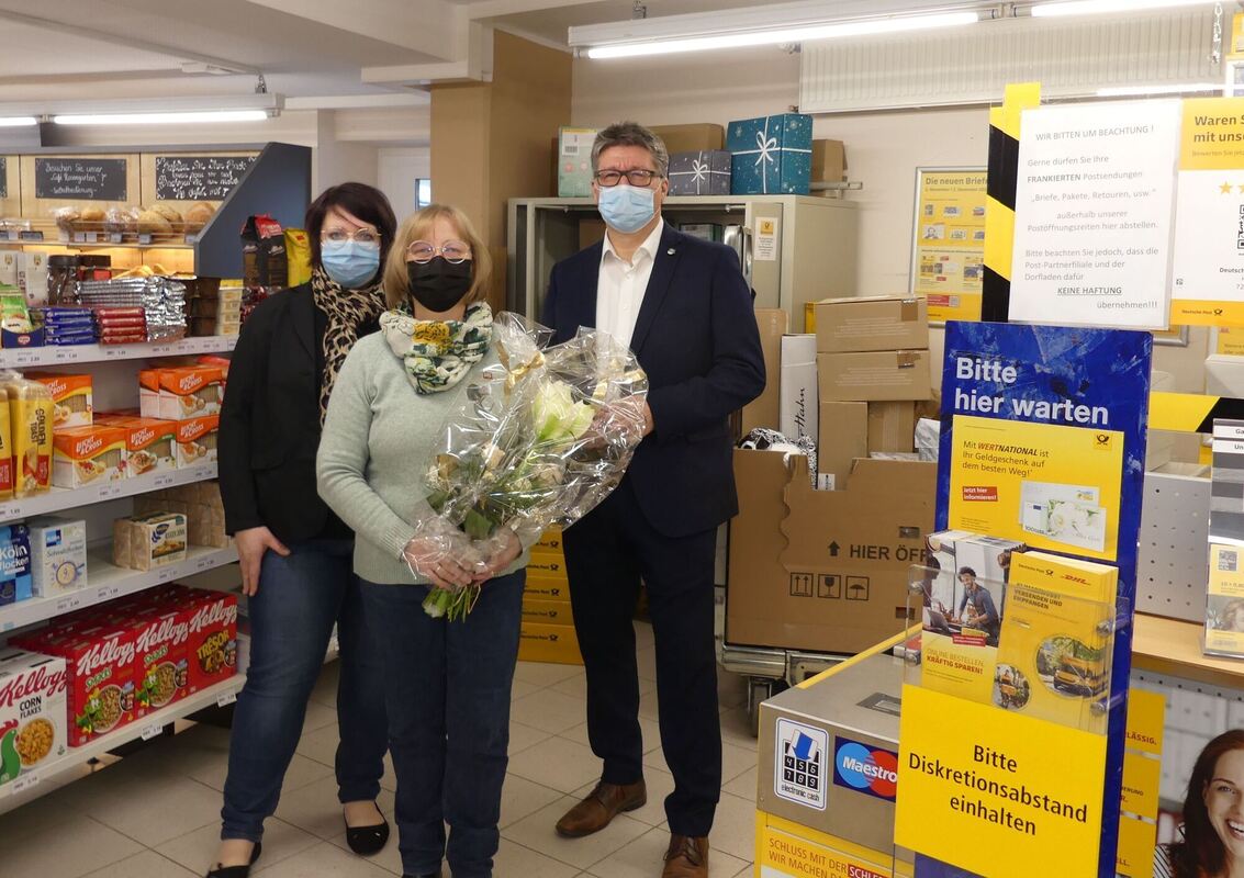 Dorfladenleiterin Corinna Kroh (links), Rita Scheu, zuständig für die Postfiliale und Hülbens Bürgermeister Siegmund Ganser. FOTO: SANDER