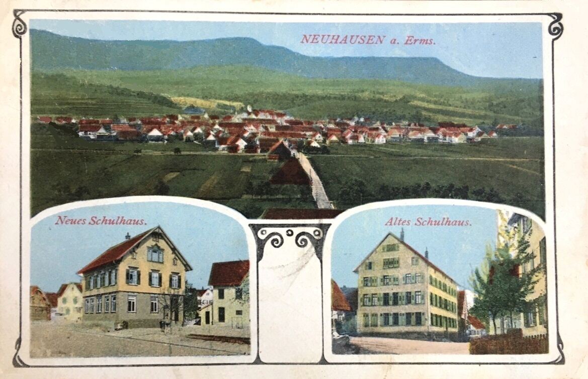 METZINGEN. Die nebenstehende Postkarte gibt drei Ansichten von Neuhausen um das Jahr 1910 wieder. Das große obere Bild zeigt eine Ortsansicht, die vom Hofbühl aus nach Süden aufgenommen worden ist. Gut zu erkennen ist der Dachfirst der Äußeren Kelter, die Mittlere Kelter und die Innere Kelter. Hinter der Bahnlinie liegt Neuhausen. Aus dem Gewirr der Dächer ragt der Kirchturm heraus. Im Hintergrund ist der Albtrauf zu sehen.