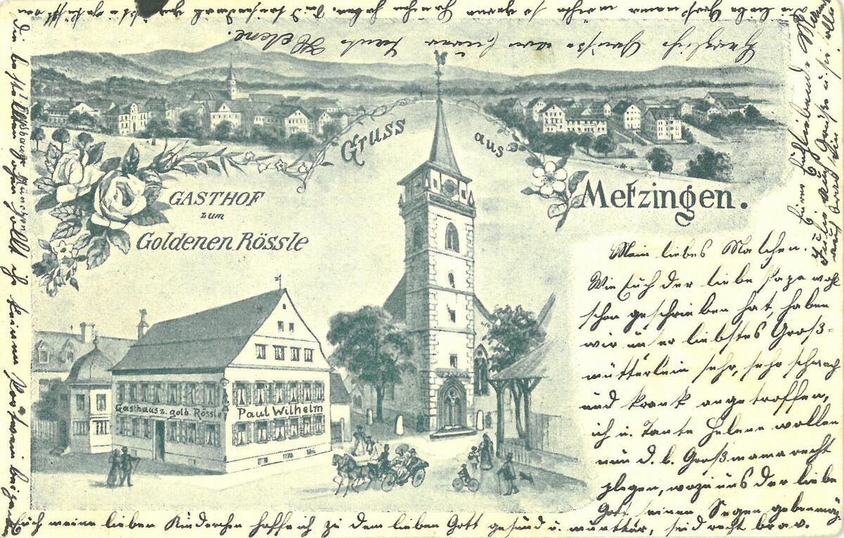 METZINGEN. Die Postkarte aus dem Jahr 1899 zeigt oben eine Stadtansicht von Metzingen aus nordöstlicher Richtung. Darunter ist die Martinskirche sowie der Gasthof zum Goldenen Rössle zu sehen. Dieser zählte damals zu den bedeutendsten Wirtschaften am Ort. Er stand zwischen altem Schulhaus und der Martinskirche und brannte im Februar 1915 nieder, wie Stadtarchivar Rolf Bidlingmaier berichtet, der die nebenstehende Postkarte im städtischen Fundus hat.