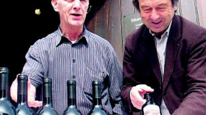 Pro Museo: Albrecht Seitz und Walter Veit vom Förderkreis Metzinger Keltern freuen sich über die Wein-Sonderedition zugunsten des Museums.