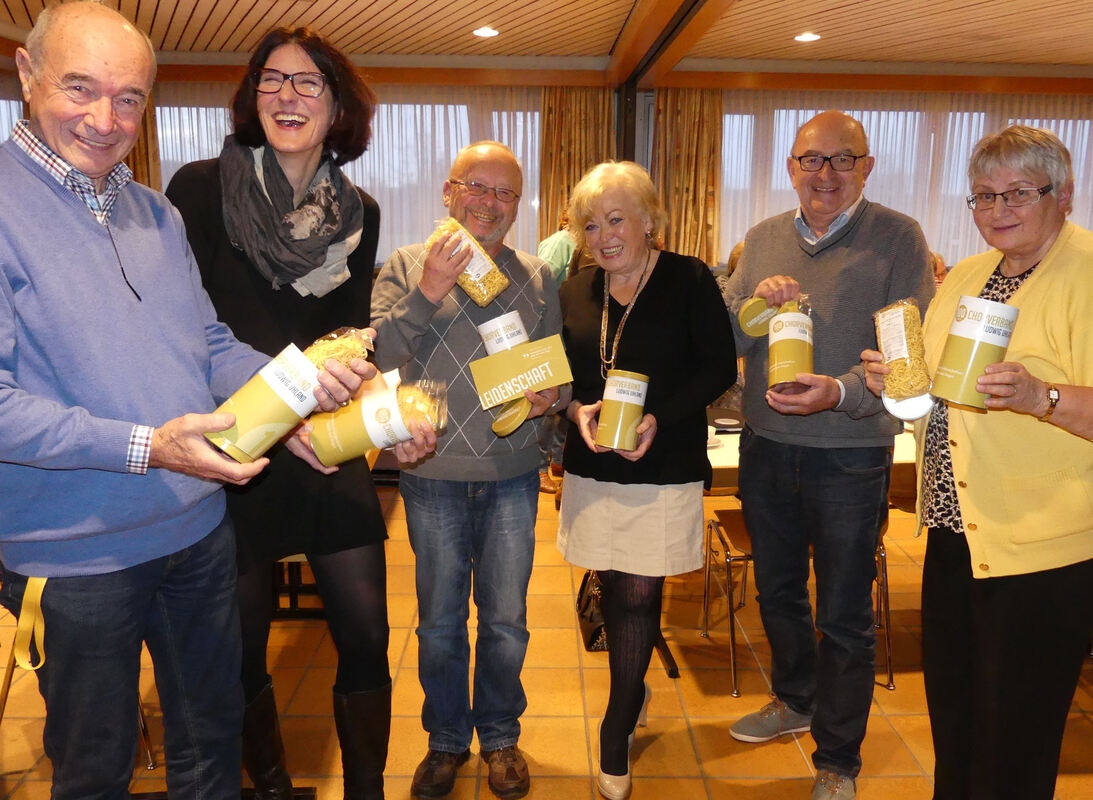 Der Chorverband Ludwig Uhland macht mit Spätzle auf sich aufmerksam. Von links: Hermann Fleck, Nicole Kümmerle, Waldemar Koitsch, Rosi Hertl, Günter Hau und Irmgard Naumann. FOTO: SANDER