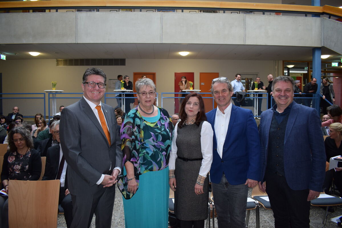 Schulleiterin Gabriele Antoni (Zweite von links) wurde nach 15 Jahren in den Ruhestand verabschiedet. Es gratulierten (von links): Hülbens Bürgermeister Siegmund Ganser, Nachfolgerin Jana Feske und die Direktoren des Staatlichen Schulamts Tübingen Roland Hocker und Udo Paulus. FOTO: WEBER