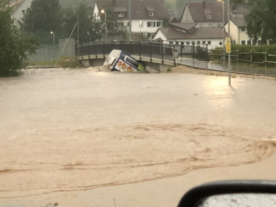 Wo sonst auf dem Supermarktparkplatz Autos stehen, ist der Fluss Echaz in Wannweil über die Ufer getreten.