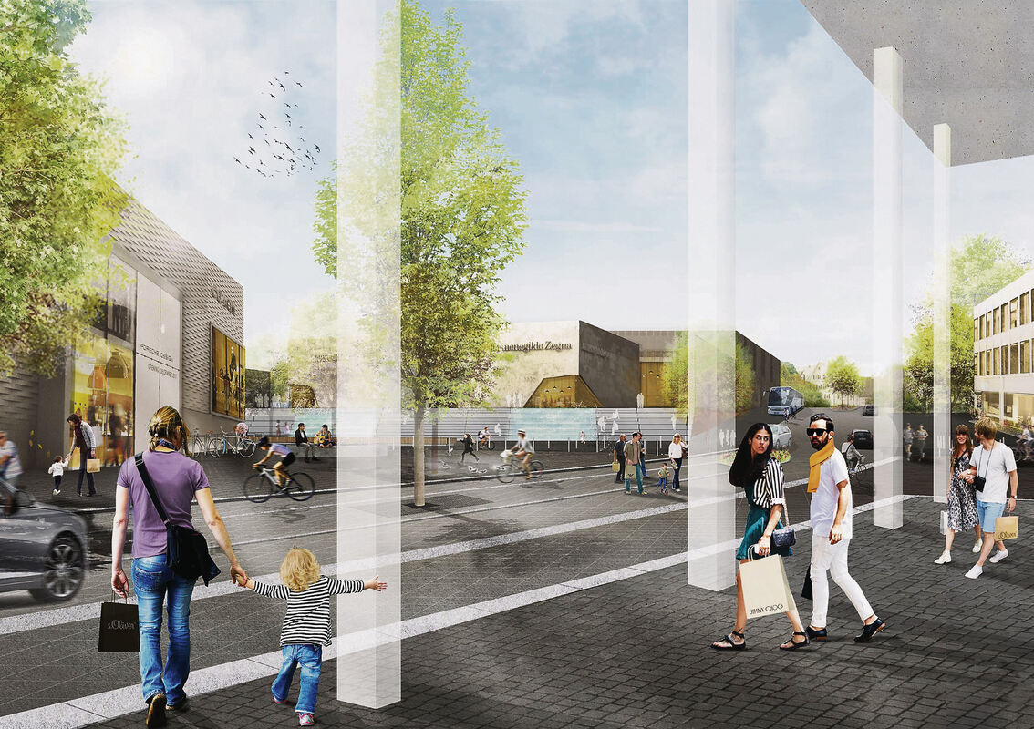 Mittelinsel, Bäume, Arkaden, echtes und Fake-Pflaster: So stellen sich die Planer die Reutlinger Straße zwischen Christian-Völter-Straße und Ermskanal vor. VISUALISIERUNG: BRUUN & MÖLLERS