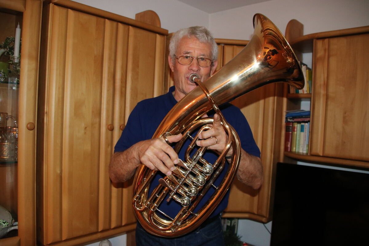 Herbert Schall und sein Tenorhorn: Seit 66 Jahren spielt er aktiv bei den Ermstalmusikanten mit. FOTOS: OECHSNER