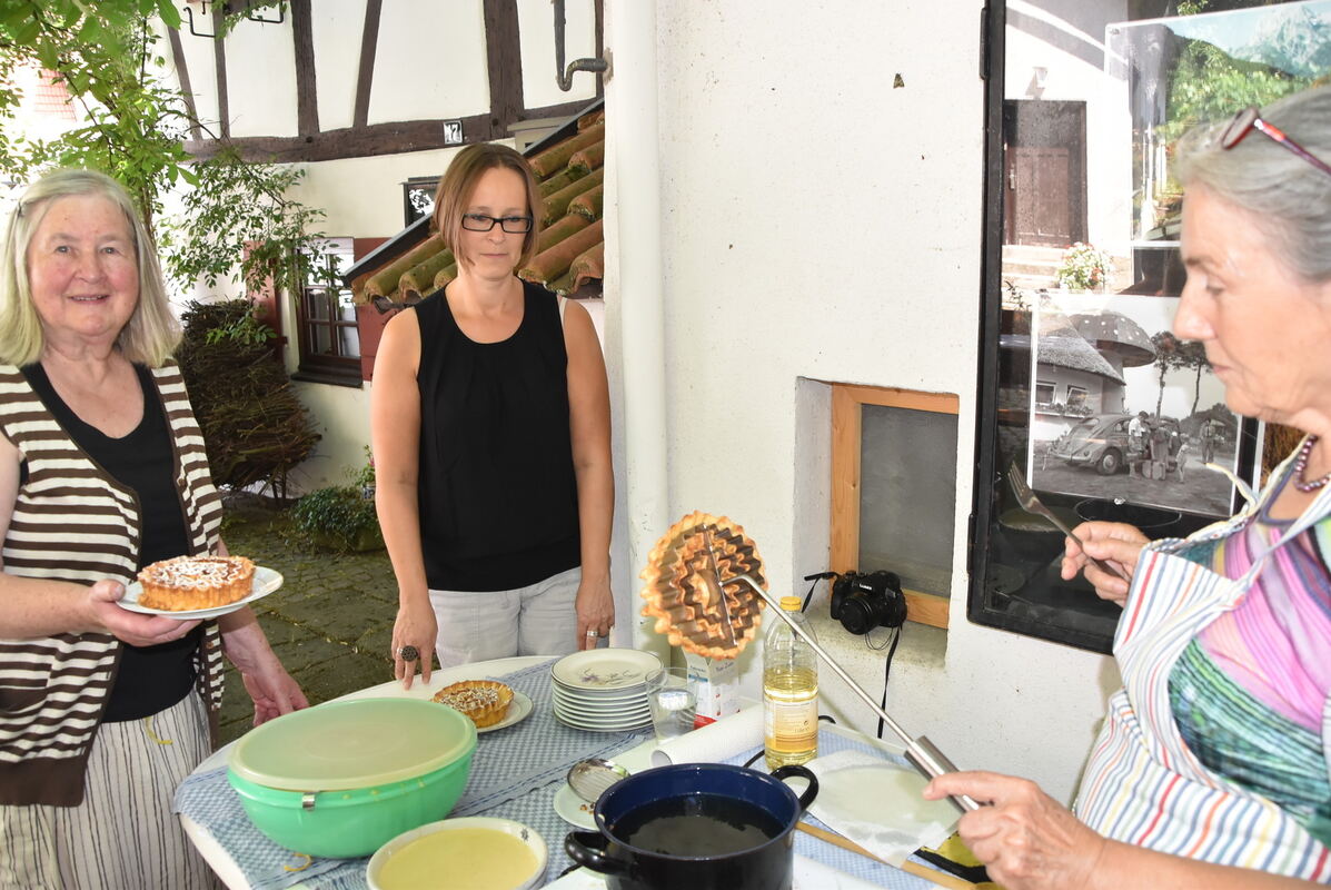 Im Hof des historischen Gebäudes kamen die Süßspeisen super an. Doris Schuster und Melanie Litzkow (von links) freuen sich auf die Küchle, die Elfriede Gabernowitz ganz frisch auf den Teller legt. FOTO: MAR