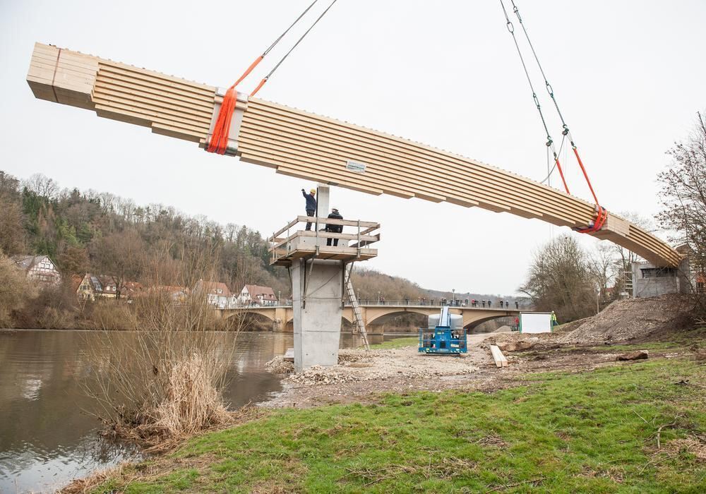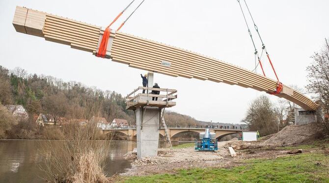 Mit Schwung und Stil über den Neckar: Schon bei der Anlieferung der ersten Holzelemente wurde deutlich: Die neue Fuß- und Radwegbrücke wird eine Elegante. FOTO: GAUSS