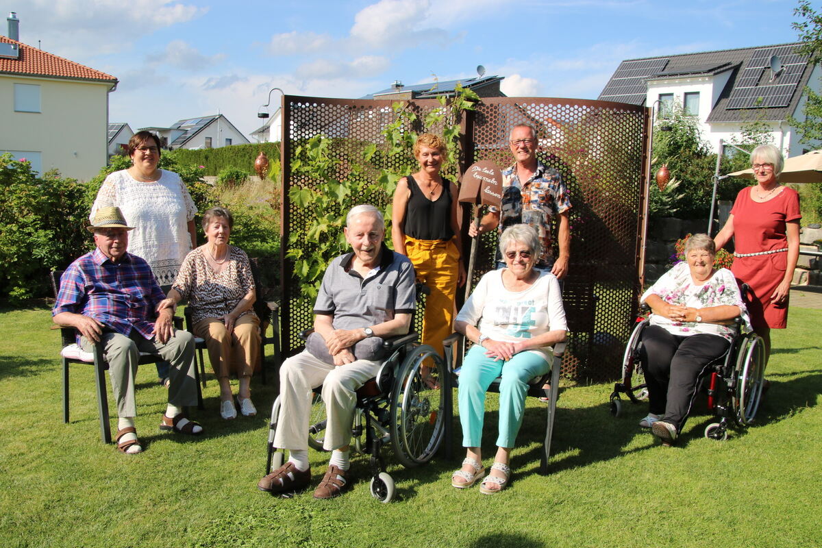 Sie bilden während ihres Urlaubsaufenthalts in Hengen sozusagen eine Ferien-Wohngemeinschaft (von links): Rolf und Erika Weik mit Urlaubsidyll-Mitarbeiterin Andrea Röser, Erwin Zeller und Gunda Müller sowie Margrit Lembke und Diana Hoffmann. Im Hintergrund stehen die Gastgeber Sabine und Andreas Seckinger.