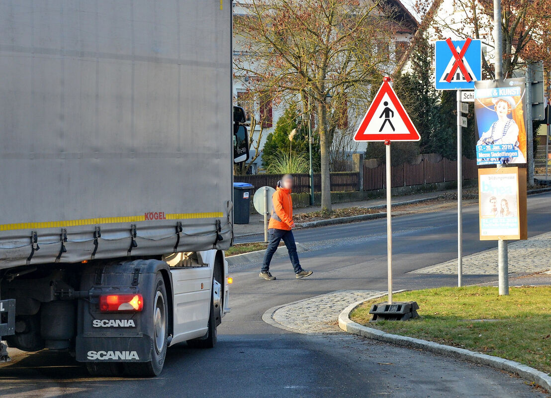 Achtung Fußgänger statt Zebrastreifen: eine Warnung an Fahrzeugführer, besonders aufmerksam und rücksichtsvoll zu fahren. Verkehrsrechtlich ist das für die Fußgänger aber nicht so sicher wie bei einem Zebrastreifen. FOTO: NIETHAMMER