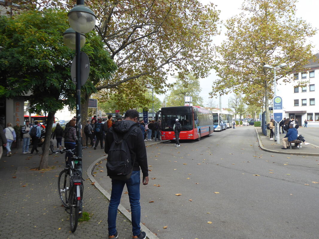 Als wir aussteigen, fällt uns eine Diskussion zwischen einer jungen Auszubildenden und einem Ordner auf. Sie sagt zu ihm: »Wenn ich diesen Bus jetzt nicht bekomme, dann komme ich zu spät zur Schule!« Sie zeigt dabei auf einen abfahrenden, vollen Bus. Uns berichtet sie später, dass einige Busse früher als geplant abfahren, während andere überhaupt nicht kommen. Die Auszubildende, namens Nathalie Arnold, beschwert sich, dass sie mit dem Schienenersatzverkehr dreimal so lange für ihren Schulweg brauche, als zuvor. Auf die Frage, was am Schienenersatzverkehr positiv sei, antwortet sie knapp »gar nichts«. Stattdessen erzählt sie von Platzmangel in den Bussen und schlechten Taktungen.