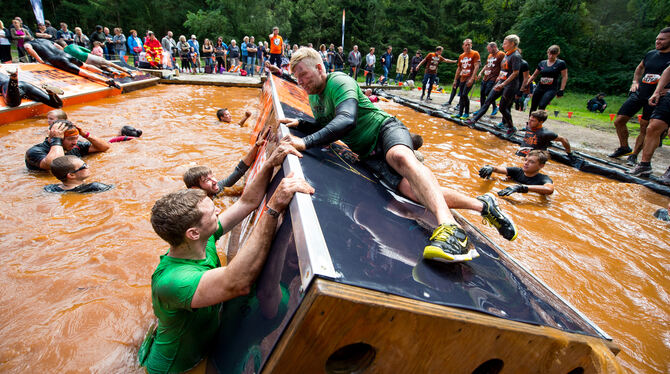 Was die Hindernisse angeht, können die »Tough Mudder«- Wettkämpfe – im Bild einer bei Hermannsburg in Niedersachsen – als Vorbild für den Mudmates-Lauf in Metzingen gelten. Doch steht bei Mudmates noch mehr der Teamgedanke im Vordergrund. FOTO: DPA/SCHULZE
