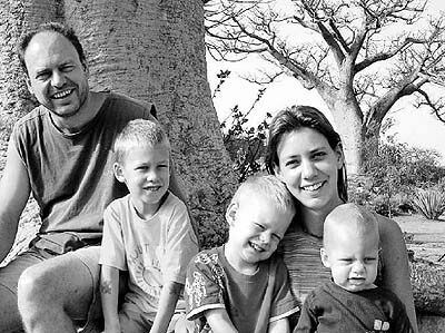 Jetzt auf Heimaturlaub und bald wieder im Senegal: Cornelia und Jens Auer mit ihren drei Söhnen unterm Affenbrotbaum.