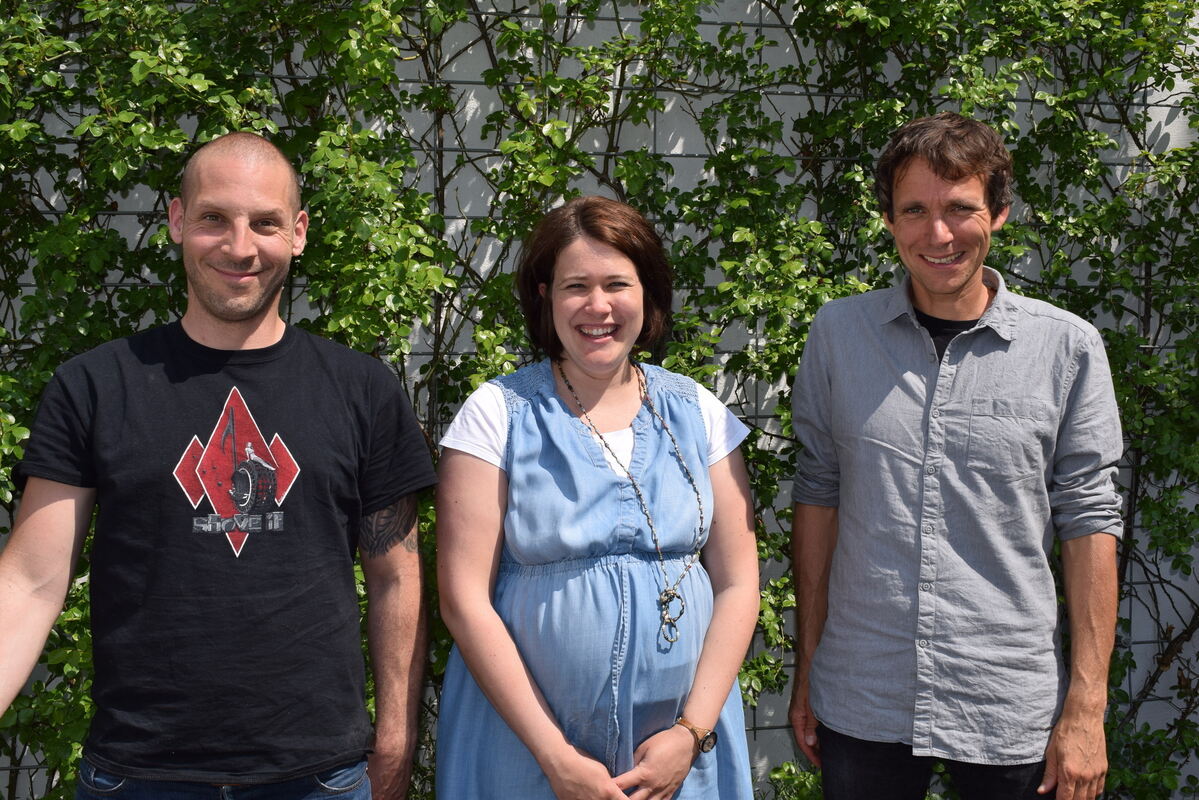 Bäckermeister Michael Moll, Sina Mayer, Chefin der Bäckerei Mayer, und Oliver Keppeler von der Hilfsorganisation Asha 21 (von links) im GEA-Redaktionsgarten. Sie wollen eine Bäckerei mit Café in der Hauptstadt von Nepal, Kathmandu, aufbauen und schwäbisch-europäische Backkultur an den Start bringen. FOTO: RITTGEROTH
