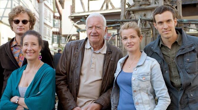 Die Schauspieler Marcus Morlinghaus (vl-r), Caroline Ebner, Peter Bongartz, Mira Bartuschek und Tobias van Dieken posieren am Dienstag in Bad Urach bei einem Fototermin zu den Dreharbeiten der neuen Vorabendserie »Heiter bis tödlich - Fuchs und Gans«.
