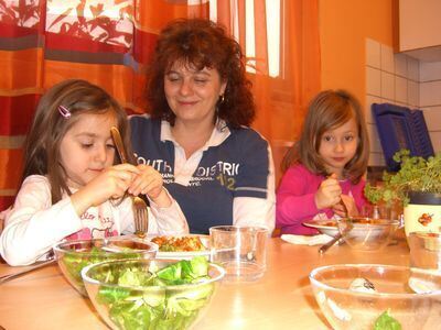 »Hirsch«-Wirtin Gudrun Kurz zwischen zwei ihrer bekochten Schützlinge, Lory-Jay (links) und Laura.