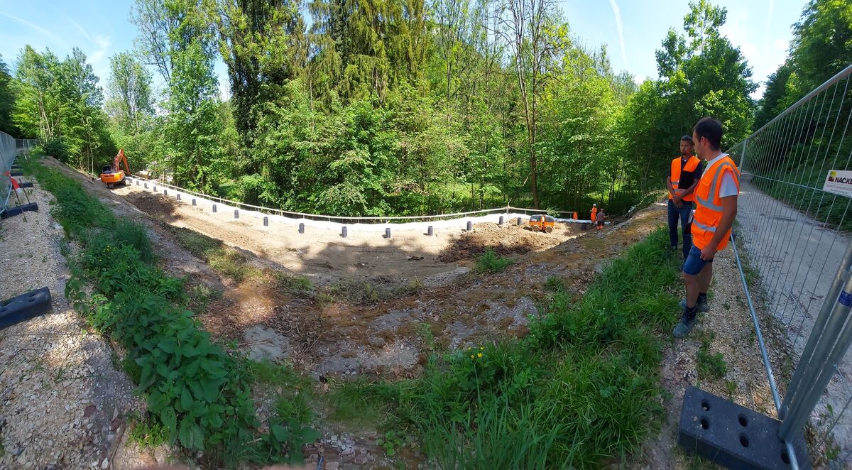 Der Grüne Weg ist am Ortsausgang Bad Urach Richtung Seeburg gesperrt. Hier sichert eine Spezial-Firma im Auftrag der Reutlinger Fair-Netz GmbH den Hang. Er droht, langsam wegzurutschen. Die Gasleitung von Metzingen nach Münsingen wäre nicht mehr sicher. Unten rechts im Bild verdichtet eine ferngesteuerte Grabenwalze den Boden.
