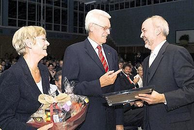 Landrat Thomas Reumann (rechts) und Otwin Brucker (hier mit seiner Frau Heide) stehen sich beim Austauschen von kleinen »Liebenswürdigkeiten« in nichts nach.