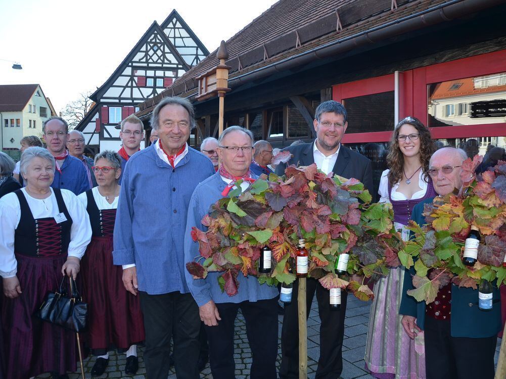 Die württembergische Weinprinzessin Franziska Leitz (2. von rechts) packte bei der Eröffnung des Sieben-Keltern-Fests in Metzingen kurzerhand ihre Querflöte aus und spielte mit. Darüber freuten sich Metzingens OB Dr. Ulrich Fiedler und Walter Veit, der Vorsitzende des Förderkreises Metzinger Keltern. Mit dem »Fahner« ausgezeichnet wurden Ernst Werz (rechts) und Karl Fischer.