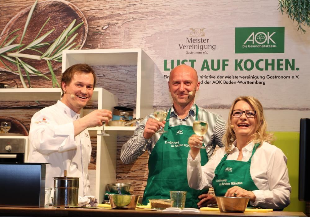 AOK-Kochshow in Metzingen: Den Wein gibt´s zwar von der Kasse immer noch nicht auf Rezept, wie (von links) Simon Tress beiläufig bemerkt, aber für Entspannung sorgte er bei Ferenc Rott allemal, der sich im Handballgeschäft einfach besser auskennt, wie hinterm Herd. Gabriele Bazlen redete ihm trotzdem gut zu und verriet dem Spitzenkoch so lange, wie man schwäbische »Wurst-Knöpfle« macht.