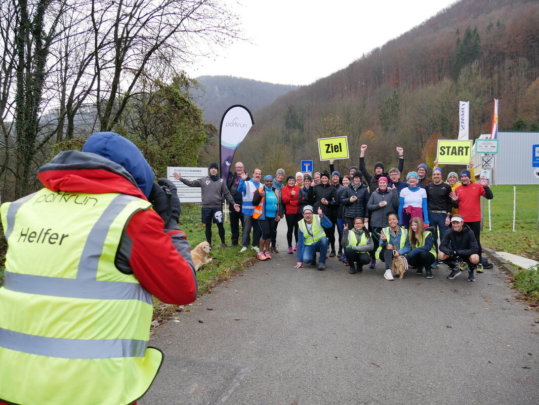 Im Ziel sind alle glücklich: Das Bild vom 30. November 2019 zeigt die Teilnehmerinnen und Teilnehmer des ersten Parkruns in Bad Urach. FOTO: FINK