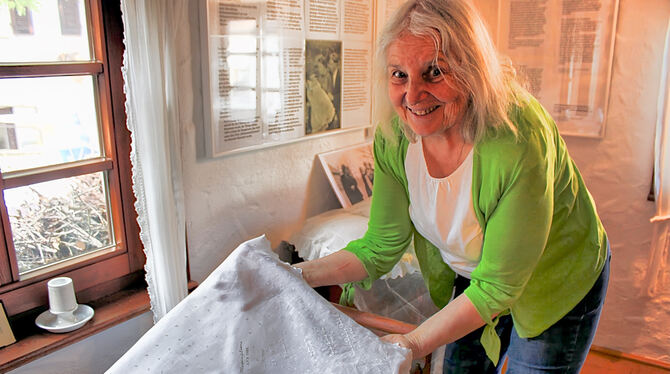 Heiderose Tiefenbach zeigt ein Taufkleid von 1913 mit eingestickten Namen.