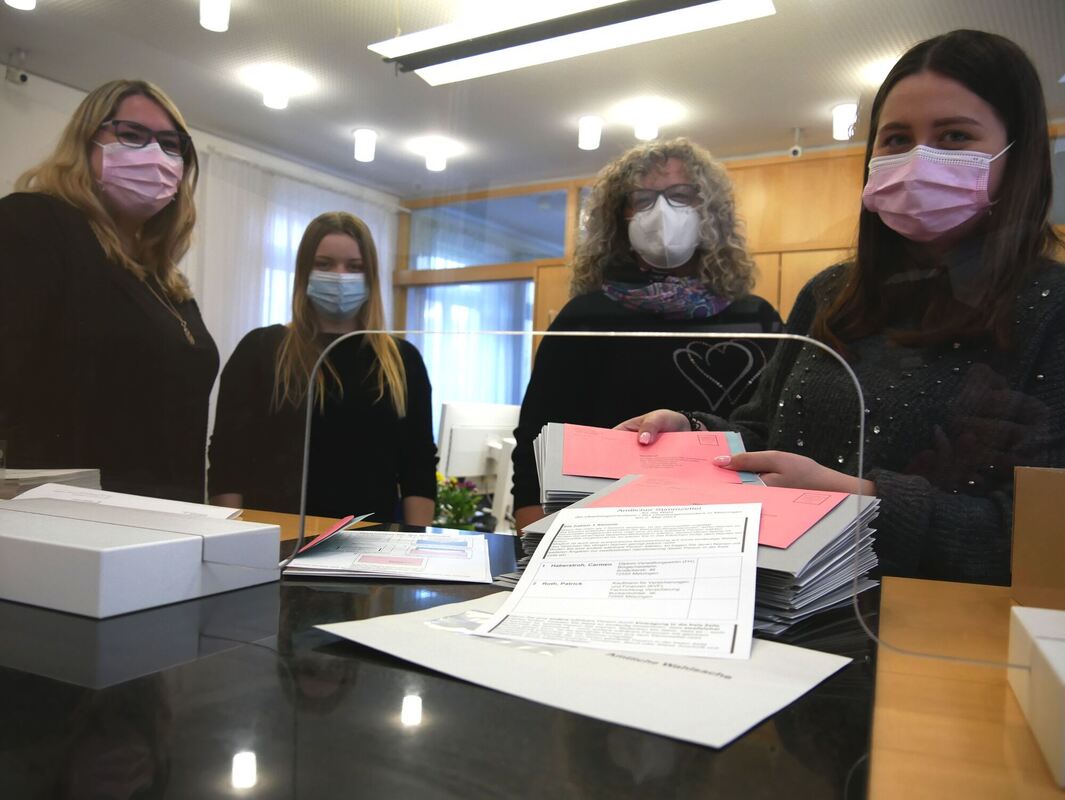 »Wir haben jetzt schon sehr viele Anfragen von Briefwählern«, sagt Julia Wiegand, die normalerweise im Bürgerbüro arbeitet. Zusammen mit ihren Kolleginnen Jana Stukart, Anke Viesel und Pia Hartnagel ist sie jetzt montags bis donnerstags von 8 bis 12 Uhr, freitags von 8 bis 12.30 Uhr und mittwochnachmittags von 15.30 bis 18.30 Uhr im Wahlbüro. Theoretisch könnte man dort sofort wählen – die Wahlkabinen, eine auf einem höhenverstellbaren Tisch, und die Urnen stehen noch von der Landtagswahl da.