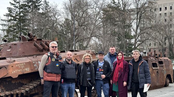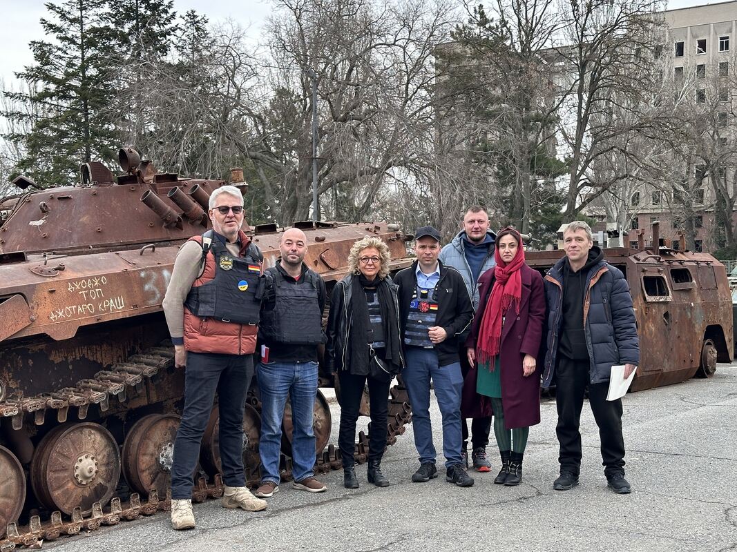 Holger Weiblen (links), der die Solidaritätsparnterschaft der drei Ermstal-Gemeinden mit Arzis koordiniert, war schon oft in der Ukraine. Das Bild zeigt ihn vor zerstörten russischen Panzern in Mykolajiw zusammen mit (von links) Holger Weiblen, Jochen Kleih, Beate Müller-Gemmeke, Martin Salzer, Alex Subkow, Übersetzerin Natalija Petrenko und Alex Spatar.