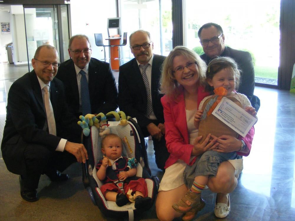 Dr. Sigrid Schmitz mit ihren Kindern Leonie (mit Scheck) und Matthis vertritt die Kleinkinderbetreuung »7 Zwerge« in Bad Urach, die in den Genuss der Ausschüttung der »Stiftung der Volksbank Metzingen-Bad Urach eG« gekommen ist. Im Hintergrund die Vorstandsmitglieder Bernd-Dieter Reusch, Ulrich Reusch, Eberhard Sailer und Karl Georg Lotz.