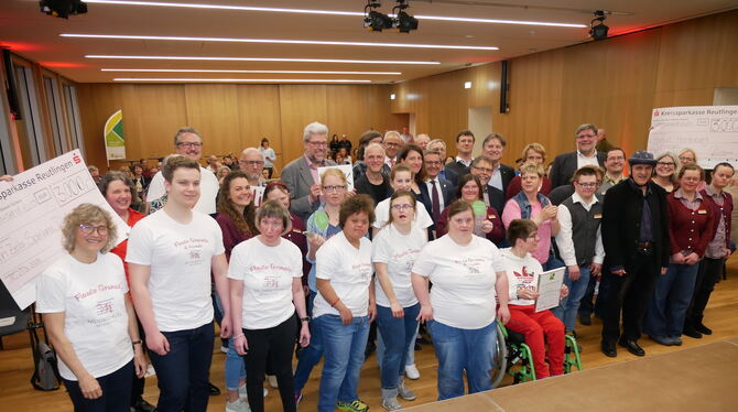 Die Freude war riesengroß bei den Geehrten, die den 2. Inklusionspreis des Landkreises in der Metzinger Kreissparkasse aus den Händen von Landessozialminister Manne Lucha, Landrat Dr. Ulrich Fiedler sowie KSK-Vorstand Michael Bläsius erhalten haben. FOTO: LEISTER