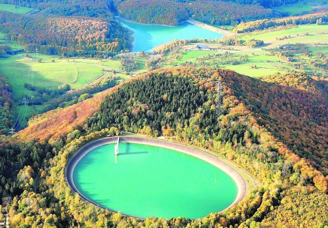 Blick aus der Luft auf das Oberbecken auf dem Grasberg (vorne) und das Unterbecken mit Krafthaus beim Stauseehotel (hinten). ARCHIVFOTO: MANFRED GROHE