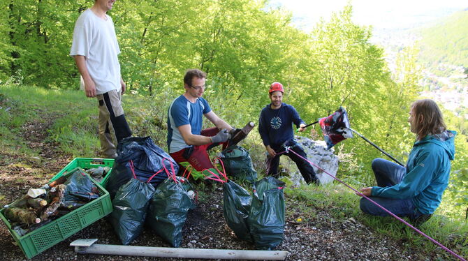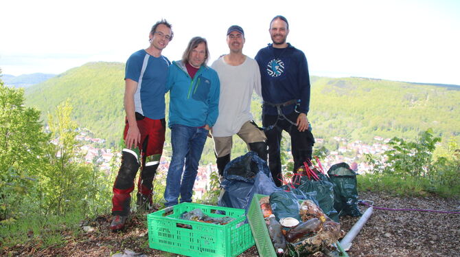 BAD URACH. Kleinstabfall ergibt auch jede Menge Müll: Zu dieser Erkenntnis kamen vier Aktive des Arbeitskreises Klettern und Naturschutz Reutlingen und des Deutschen Alpenvereins (DAV), nachdem sie zwei Stunden lang am Samstag in einem Radius von gerade mal 50 Metern den Hanner Felsen hoch über Bad Urach von Unrat befreit hatten. »Wir kratzen eigentlich nur an der Oberfläche«, kommentiert Julian Ulrich mit Blick auf die prall gefüllten Mülltüten. »Ich hatte mir gedacht, dass wir viel finden, aber mit so viel Müll hatte ich nicht gerechnet.«