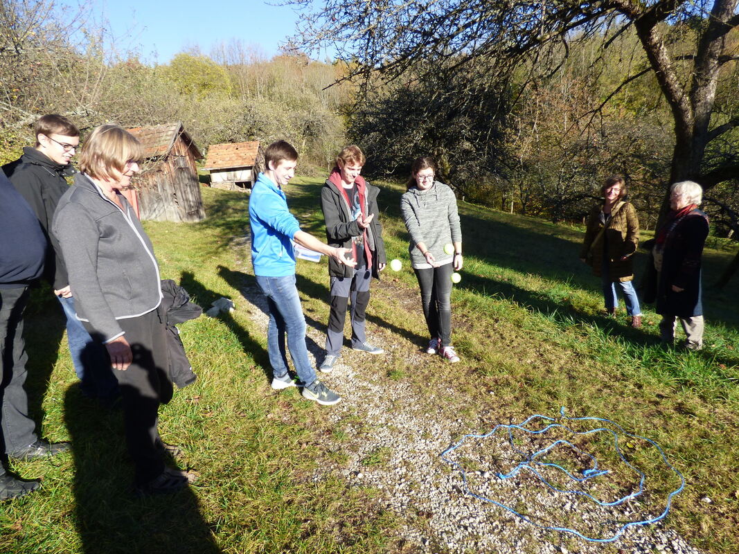 Der neue Natura Trail, der auf dem Falkenberg bei Metzingen beginnt, bietet auch Spielmöglichkeiten, wie der Leiter der Metzinger Naturfreunde-Jugendgruppe, Simon Klett (links), erklärt: In die Mitte des auf dem Boden ausgebreiteten blauen Netzes müssen Bälle geworfen werden, ein Spiel, das sich in der Starterbox befindet, die Spaziergänger und Wanderer mitbekommen, wenn sie sich im Falkenberghaus melden. FOTO: BÖRNER