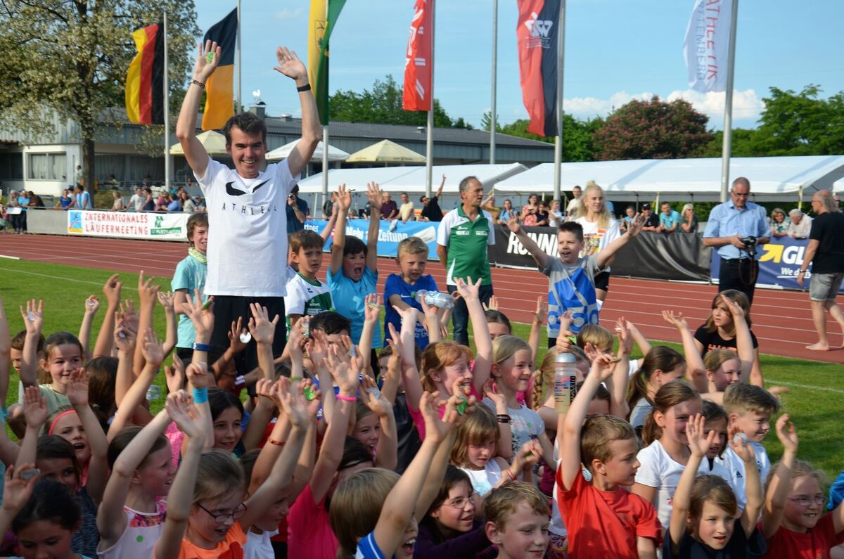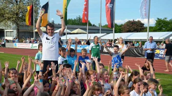 Laufpromi Arne Gabius, schnellster deutscher Marathonläufer aller Zeiten, war direkt aus dem Trainingslager in den USA ins Schönbuchstadion gekommen, wo er des Öfteren über 3 000 Meter schon gestartet war. Er begeisterte als Motivator und händigte den Nachwuchsläufern die Laufabzeichen aus. »Es ist sehr wichtig, dass sich Kinder sehr früh bewegen, dafür war dies eine beispielhafte Aktion«, sagte der Mediziner und war begeistert vom Einsatz der Kinder. Gabius durfte am Stand der Leichtathletik-EM im Sommer (7. bis 12. August) in Berlin viele Autogramme schreiben. Schon vor zwei Wochen hatte die Neu-Metzingerin Sabrina Mockenhaupt, 45-fache Deutsche Meisterin, die Kinder auf die Aktion vorbereitet.