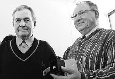 Spurensuche: Der Schulring, den Fritz Groß aus Gächingen 1957 gefunden hat, wurde jetzt dem Erben des Eigentümers Craig Ridgers (rechts) aus Kanada übergeben. Dessen Onkel war 1944 bei Seeburg abgestürzt.