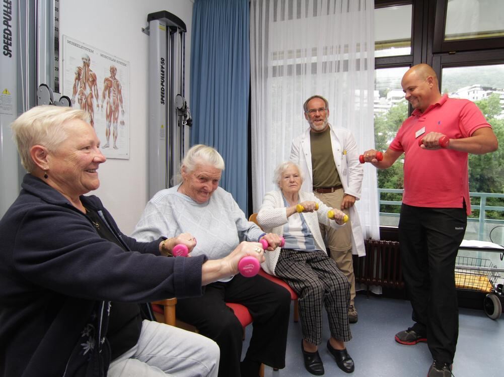 Boris Krasovc (rechts), Teamleiter der Physiotherapie in den Fachkliniken Hohenurach, bei einer Übungseinheit im Bereich der Sturzprophylaxe mit drei Damen. Im Hintergrund schaut Dr. Holger Leibfritz, Oberarzt Innere Medizin/Geriatrie, zu.
