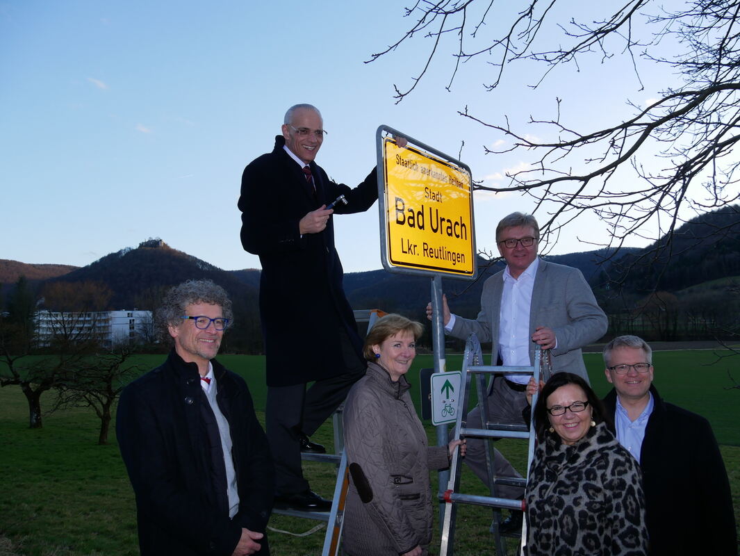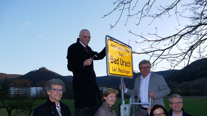 Sogar der Hohenurach strahlte im Hintergrund, als der Präsident des Heilbäderverbands Baden-Württemberg, Fritz Link (Zweiter von links), und der Bad Uracher Bürgermeister Elmar Rebmann die erste neue Ortstafel montierte. Zu ihren Füßen die von dem Präsidenten gelobten »Leistungsträger der Kur- und Heilbäder-Stadt«: Uli Wüstner (links, Fachkliniken Hohenurach), Andrea Bernardi (Alb-Thermen), Eva-Maria Rühle (Reha-Klinik Schwäbische Alb) und Tourismus-Chef Torsten Clement. FOTO: FINK