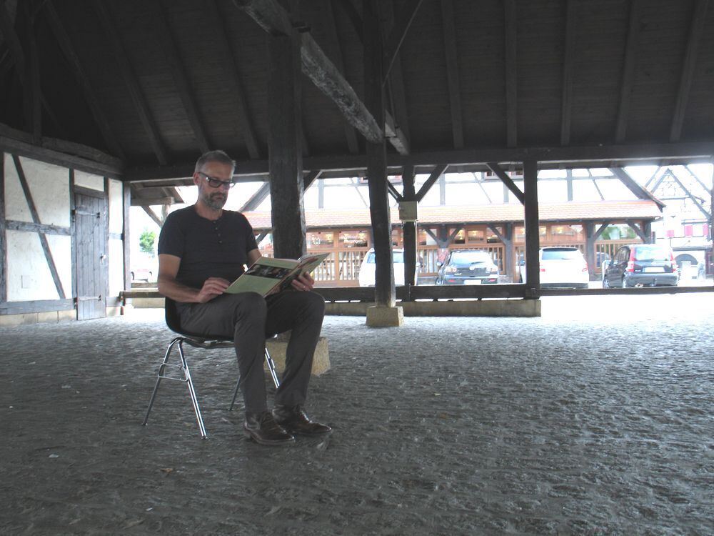 Der Leiter der Stadtbücherei Metzingen, Ulrich Koch, lesend in der Äußeren Heiligenkelter, die er sich als Dependance zur Kalebskelter wünscht. Die, im Hintergrund zu sehen, ist längst zu klein geworden. Vor allem für Präsentationen und Gruppenarbeit reicht der Platz nicht mehr aus.