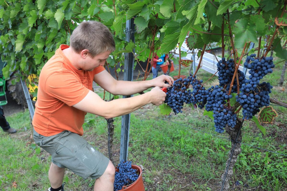 Matthias Euchner freute sich darauf, den Ertrag seines Weinbergs zu ernten. »Heute lesen wir nur Acolon«, erklärt er, »das ist eine Traubensorte, die früh reift.« Sie ist lockerbeerig, das heißt, sie trocknet schnell ab. Somit ist sie weniger anfällig gegenüber Botrytis. Das ist die Grauschimmelfäule. »Außerdem wächst sie schön aufrecht, das ist sehr angenehm.«