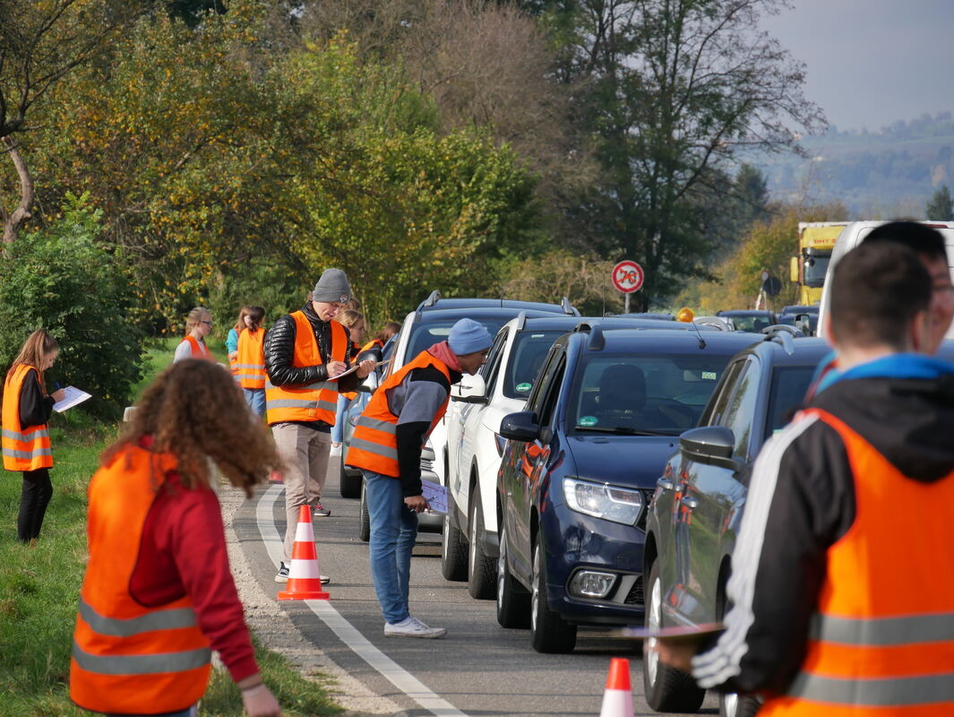 Obwohl die 14 Schülerinnen und Schüler fix und höflich arbeiten, ernten sie von Minute zu Minute mehr kritische Blicke und mäßig höfliche Antworten. Darüber wundert sich am Uracher Ortseingang von Dettingen her niemand – auch die beiden Polizisten nicht, die die Autos stoppen und beobachten. Anhalten dürfen die Schüler in orangenfarbenen Warnwesten den Verkehr nämlich nicht, das dürfen nur die Beamte in Uniform. Fakt ist: Schnell hat sich ein Stau gebildet, der bis nach Metzingen zurückreicht. Gut eine Stunde Verspätung, meldet der Verkehrsfunk.