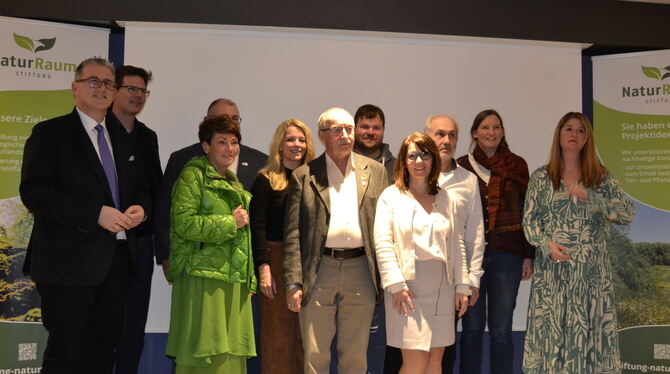 Stiftungsvorstand und -beirat, Vortragende und Ehrengäste bei der Gründungsfeier der Stiftung »NaturRaum« in der Grabenstetter Rulamanschule. FOTO: RUOF