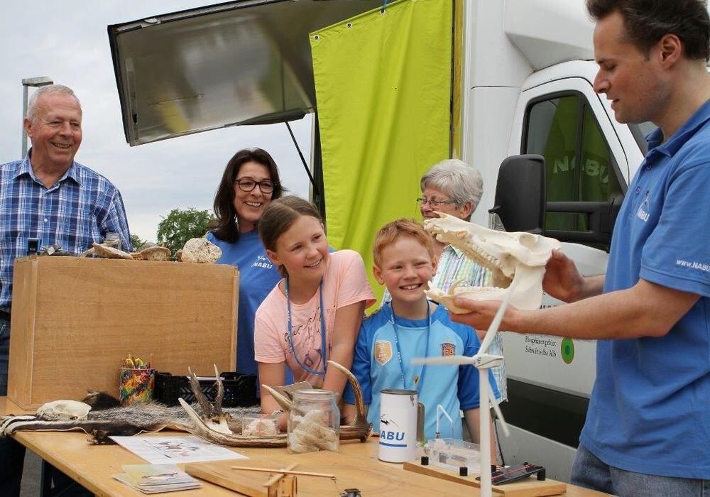 »Da können auch wir noch etwas lernen«, glauben die Großeltern von Liv (10) und Len (7), als die Nabu-Mitarbeiter Steffen Schretzmann und Edith Reiter am Nabu-Biosphärenmobil einen Wildschwein-Schädel und mehr vorzeigen.