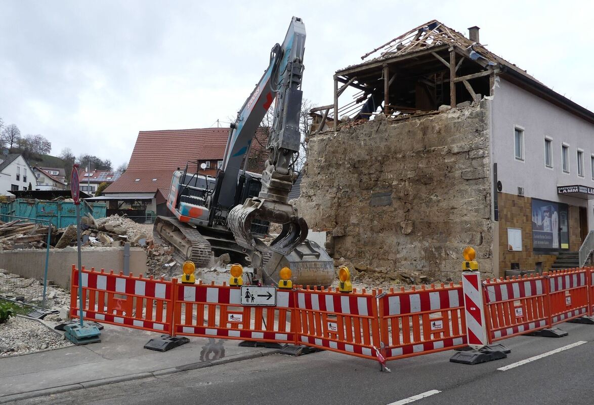 Am Donnerstag stand mittags nur noch das Gebäude des ehemaligen Gasthauses Lamm in der Nürtinger Straße. Der Bagger war unentwegt im Einsatz, sodass auch davon bald nur noch Schutt zu sehen sein wird. FOTO: SANDER