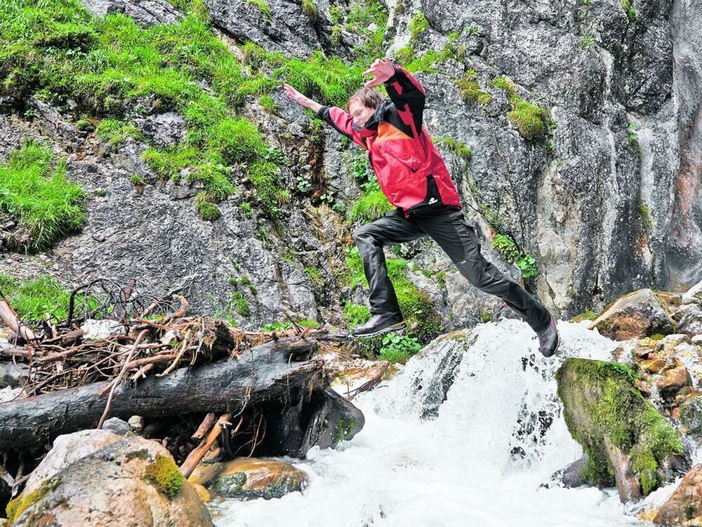 Der Outdoor-Hero kommt aus Bad Urach: Michael Nagler überspringt einen Gebirgsbach. FOTO: PR