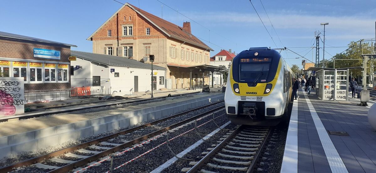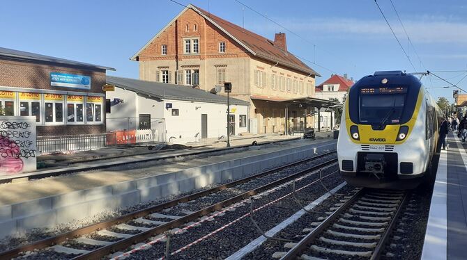 Ein Zug der SWEG Bahn Stuttgart (SBS) hält im Bahnhof Metzingen, dessen Bahnsteig am Gleis 1 gerade umgebaut wird. Das soll bis zum 24. Oktober geschafft sein.