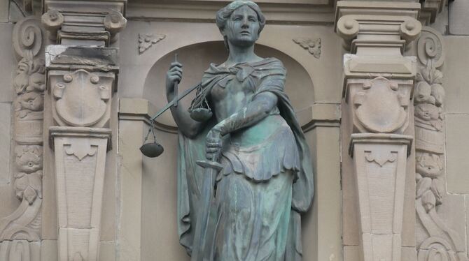 Justizia wacht als Statue an der Fassade des Amtsgerichts Reutlingen.