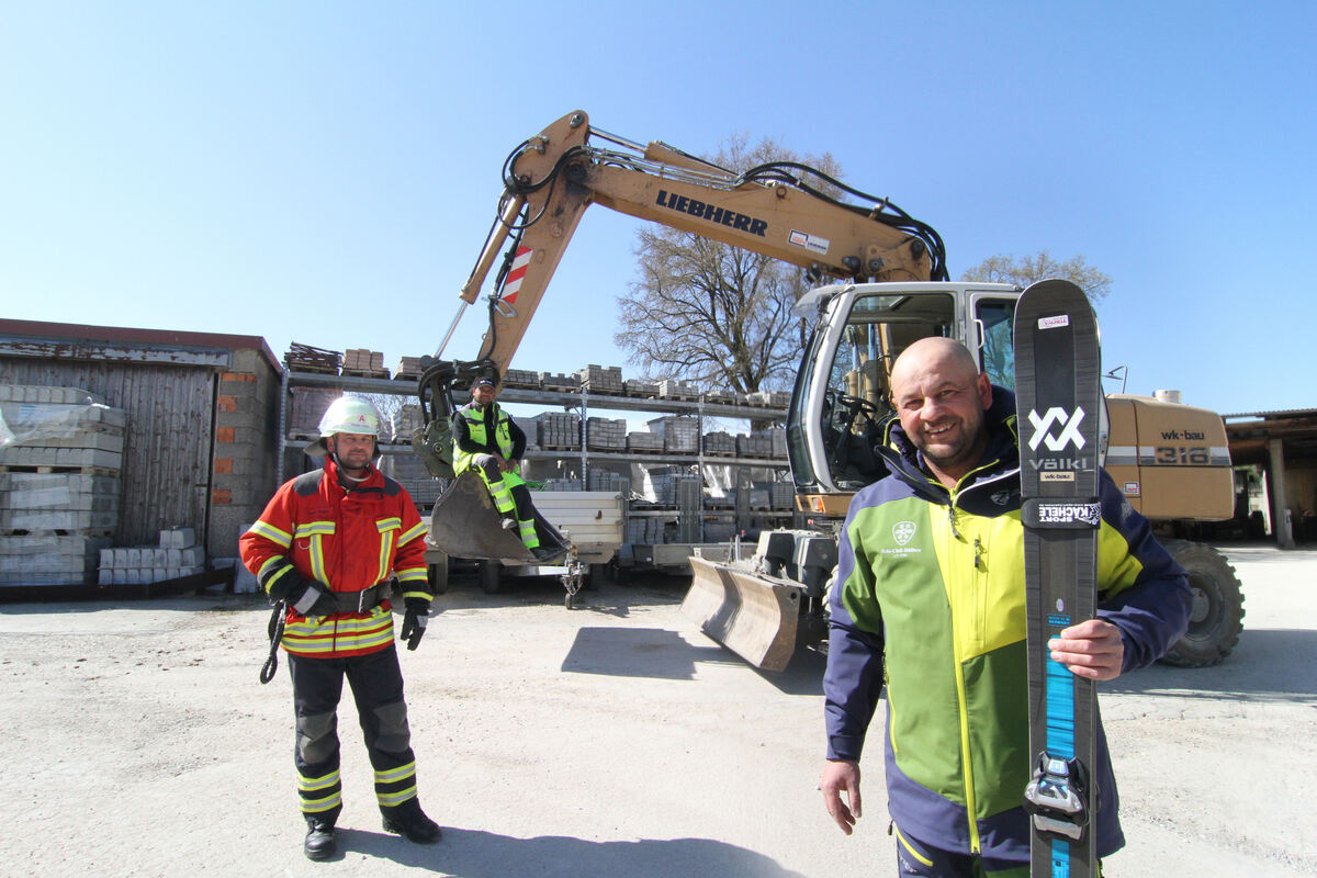 Andre Kuder in seiner Funktion als (von links) Feuerwehrmann, Bauunternehmer und Skilehrer. Für sein vielfältiges Engagement in der Gemeinde ist der Hülbener beim 50-Jahre-Fest des Schi-Clubs mit der Gemeindeplakette in Bronze, der Ehrennadel des Schwäbischen Skiverbands und der Landesehrennadel ausgezeichnet worden. FOTOS/MONTAGE: FINK