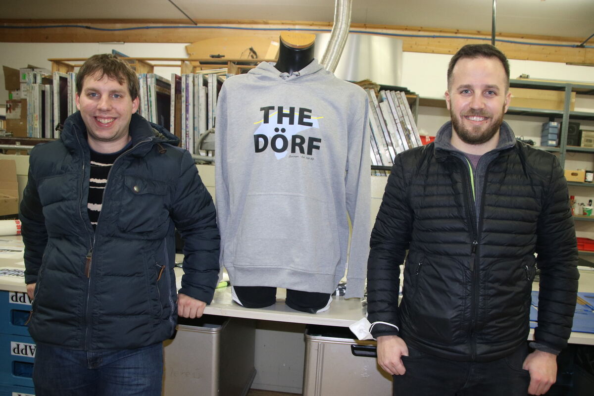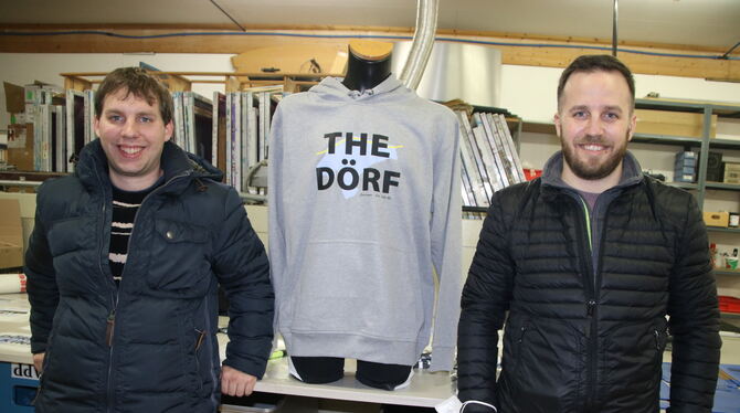 Daniel Blochinger (links) und Christian Egeler sind die Initiatoren der »The Dörf«-Kampagne − inzwischen gibt’s Verkaufsartikel mit Spendenhintergrund: Je fünf Euro kommen der evangelischen Kirche zu.