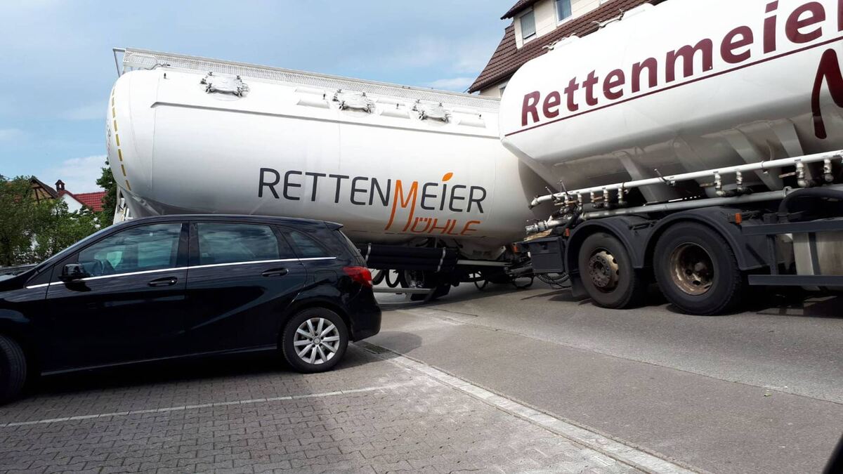 WALDDORFHÄSLACH. Ein Lastwagen eines Mühlenunternehmens aus Horb am Neckar ist gestern Mittag in Walddorfhäslach verunglückt. Der Lastzug bestehend aus zwei Silobehältern, war in der Stuttgarter Straße unterwegs. Der Fahrer war dort dabei mit seinem tonnenschweren Gefährt rückwärts zu rangieren. Dabei geriet der Anhänger laut Polizei in einen zu spitzen Winkel und kippte um. Zur Bergung wurde ein Kran bestellt, der den Anhänger wieder aufrichtete.