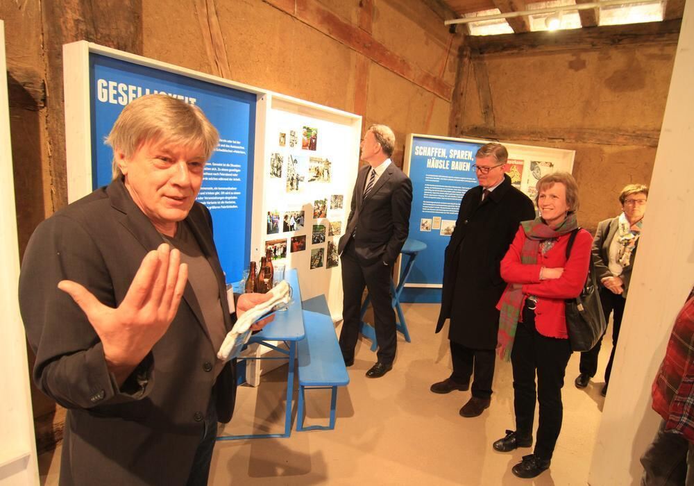 Werner Unseld (links) präsentiert die von ihm kuratierte Ausstellung »Typisch schwäbisch?!« im Freilichtmuseum Beuren, das am 20. März nach der Winterpause wieder öffnet. Neben ihm (abgewandt) der Vorstandsvorsitzende der Kreissparkasse Esslingen-Nürtingen, Burkhard Wittmacher, Landrat Heinz Eininger und Museumsleiterin Steffi Cornelius.